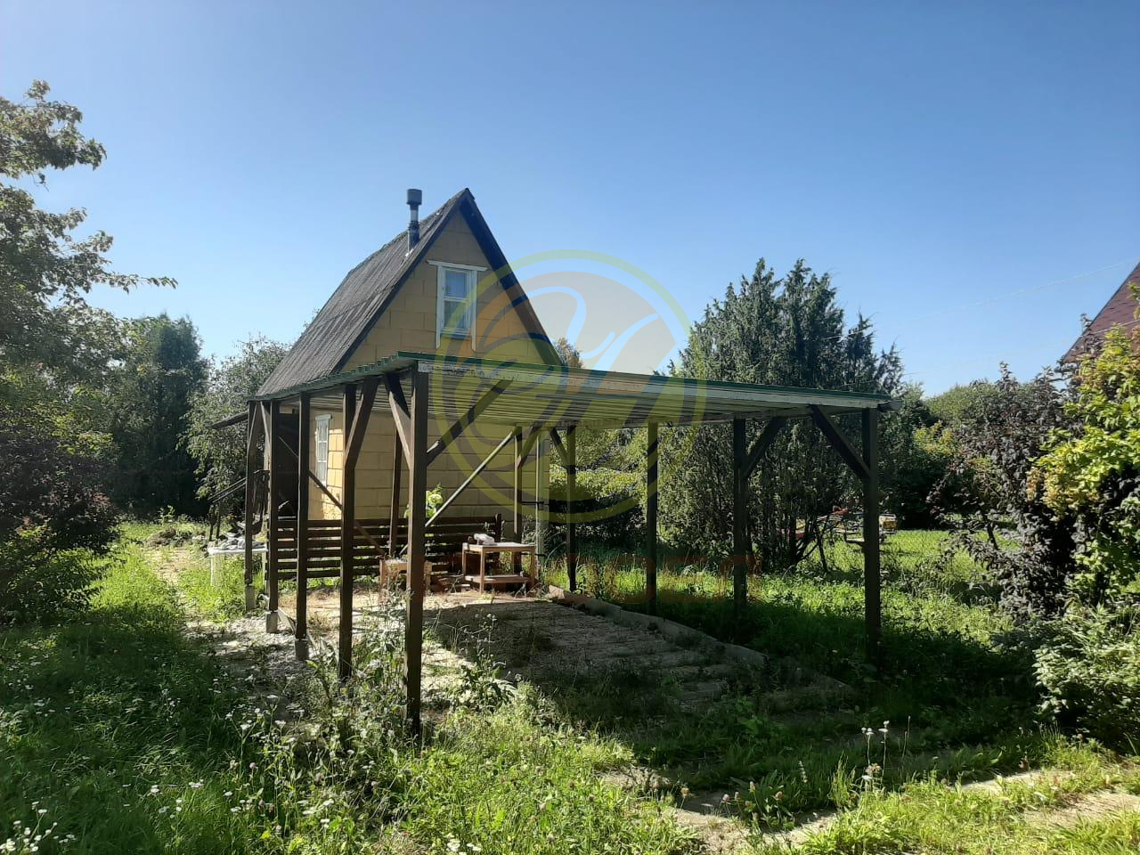 Во дворе дома установлен большой навес для машины.