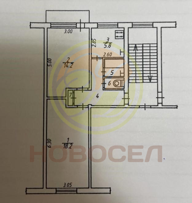 Общая площадь 48,8 кв.м. Кухня 6 кв.м. Изолированные комнаты 14,2 кв.м. и 18,2 кв.м. Совмещенный санузел. Гардеробная.