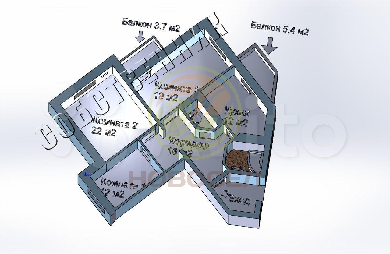 Объект номер 1025626. Продается 3-к. квартира, площадью 89,4 м², на 14/16 эт. на Молодежной 44. Собственник один. Дом 2015 г постройки. 14-й этаж. Коридор - 16 м2; - Комната 1 - 12 м2; - Комната 2 - 22 м2; - Комната 3 - 19,6 м2; - Кухня - 12,3 м2; - Ванна - 5 м2; - Туалет - 2 ,5 м2; - Балкон кухни - 5,4 м2; - Балкон комнаты 3 - 3,7 м2. Потолки 2,7 м, шпаклевка-покраска (не натяжные). Электрика. Разделена проводка розеток и освещения. От вводного щитка каждая комната имеет отдельный автомат и провод на свет, отдельный автомат и провод на розетки, также предусмотрены отдельные дополнительные провода на балконы, на кухню и в комнату 2 (например для кондиционера). В каждой комнате достаточное количество розеток. Коридор большой, поэтому есть проходной выключатель.